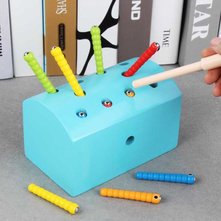 Замечательная игра для самых маленьких "Поймай червячка", 10 червячков прячутся в сундучке и радостно вылезут, цепляясь за палочку-удочку с магнитом.