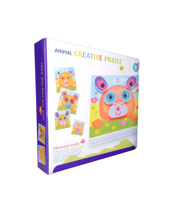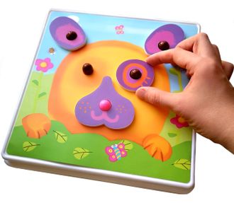 Креативный пазл для малышей представляет собой поле и небольшые колышки, куда ребенок с легкостью сможет нанизывать ушки-лазки и мордочки. В комплекте более 50 элементов, с помощью которых прекрасно развивать фантазию и речевой запас. Придумывайте смешные названия новым зверятам, рассуждайте- добрый ли он, хищник, что любит делать, где живет.