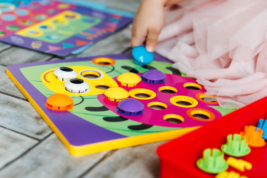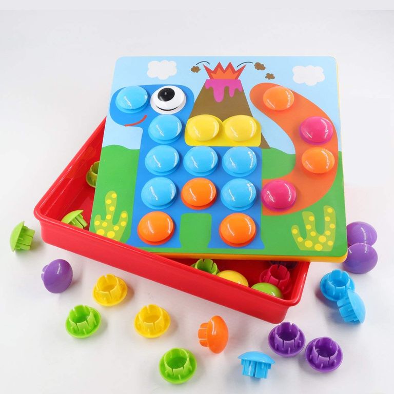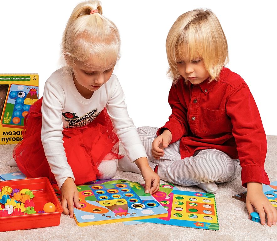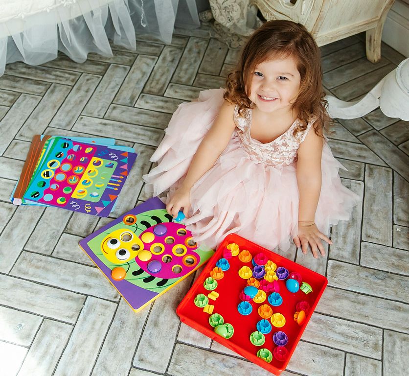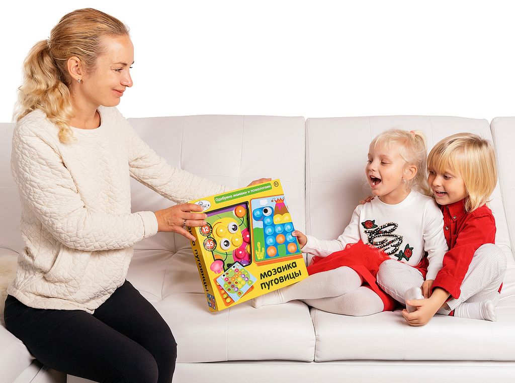 Большая мозаика "Пуговицы" , покорившая уже тысячи детей. Представляет из себя поле 31х31 см, на которое устанавливается картинка-трафарет. Малыш должен подобрать пуговки-мозаики, соответственно цветам на трафарете. Кнопки очень удобны для детских ручек.