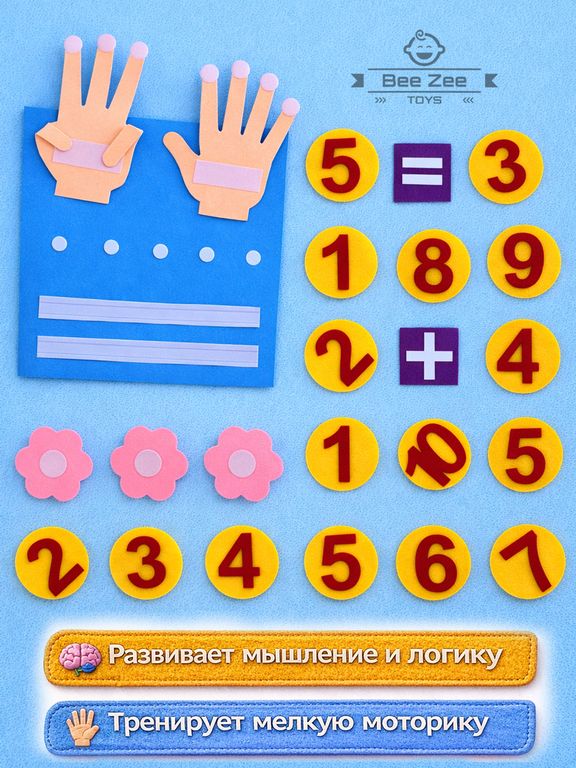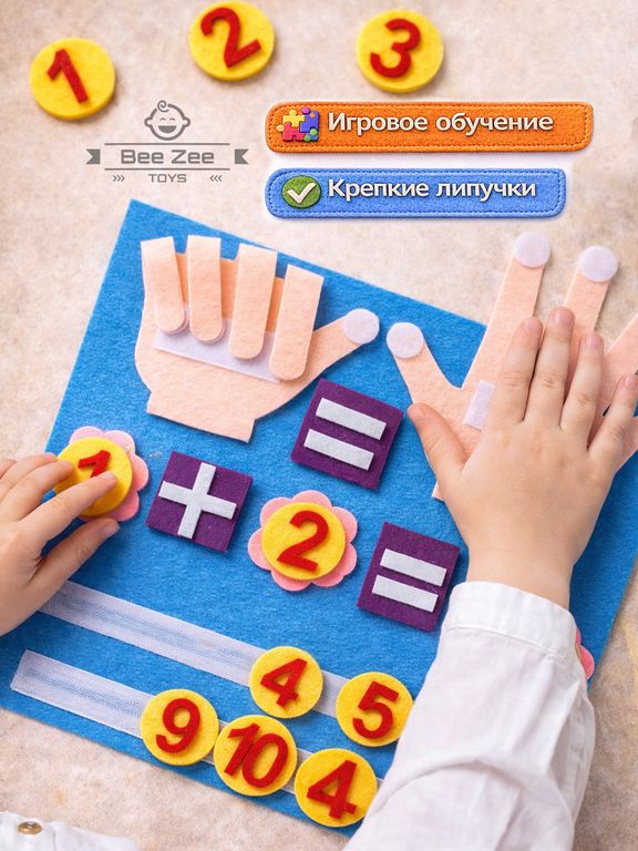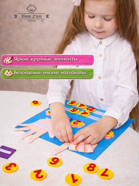 Увлекательное пособие для обучения детей счету, сделано из натурального фетра, приятного на ощупь. Как известно, почти всегда обучение азам математики начинается со счета на пальцах. Ваш ребенок с энтузиазмом будет играть с пальчиками, похожими на его собственные, сгибать и разгибать их, а маленькие липучки, которые удерживают согнутый пальчик добавят интереса к процессу.